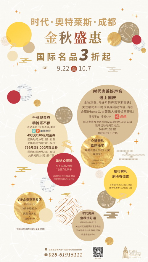除本身的建筑极具风情,供消费者驻足休闲以外,成都时代奥特莱斯以“金秋时代 盛惠奥莱”为主题的国庆黄金假期购物盛宴将于9月22日正式开启:“时代奥莱好声音遇上国庆”唱吧线上活动、购物金秋心愿礼、银行有礼,刷卡惊喜、千张现金券秒杀、暖心太平洋等活动于9月22日起将领先袭来,囊括折扣、好礼、美景、音乐、潮流、出行、美食等几大元素,意在打造中秋国庆出行、一站式购物空间,做顾客省心购物的假期指南。