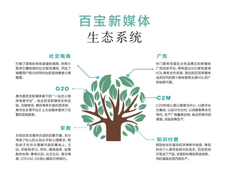 纵观百宝新媒体的成长之路,从小小包麻麻帮助不具知名度的品牌冷启动开始,一步一步迎来了自己的发展之路。2015年才进入国内市场Little Freddie小皮,在与小小包麻麻合作之后已经取得了巨大成功。数据显示,小小包麻麻已经帮助Little Freddie小皮销售20多万套产品,销售额近3000万。同样的冷启动的案例还有很多,现在在国内已经被众多家庭熟知的Webber Naturals韦博天然保健品、Stephen Joseph小史蒂芬等等也都是小小包麻麻的合作品牌。小小包麻麻在2017年10月份完成1.4亿元B轮融资,由拉芳家化及新东方集团共同投资,与此同时,小小包麻麻正式宣布将自己的整体品牌形象升级为“百宝新媒体”,由单一的母婴微信公众号“小小包麻麻”拓展为百宝新媒体矩阵,其中覆盖母婴矩阵、女性矩阵、综艺矩阵、明星矩阵四大营销矩阵,实现多样化营销,百宝新媒体从此踏上了新的征程。实现了包括社交电商、O2O、早教、广告、C2M、知识付费等多样化营销,并形成了完整的百宝新媒体生态体系。