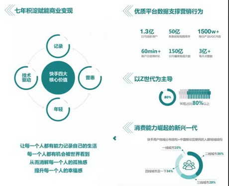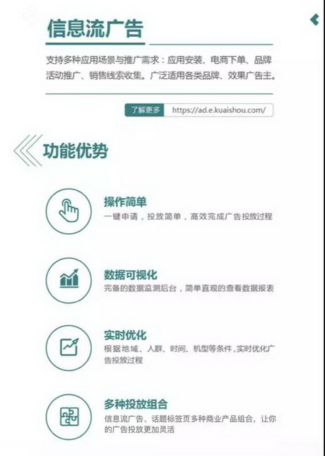 快手对广告的应用安装、电商下单、品牌推广、销售线索收集四大商业需求,都提供了完整的商业解决方案,普惠商业合作伙伴。