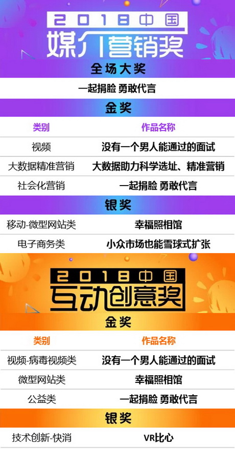 2018中国国际广告节中,由腾讯社交广告参与及报送的《一起捐脸 勇敢代言》、《没有一个男人能通过的面试》、《幸福照相馆》、《大数据助力科学选址 精准营销》、《VR比心》等众多优秀作品,最终斩获媒介营销奖全场大奖及三金二银,以及互动创意奖三金一银共十个奖项。