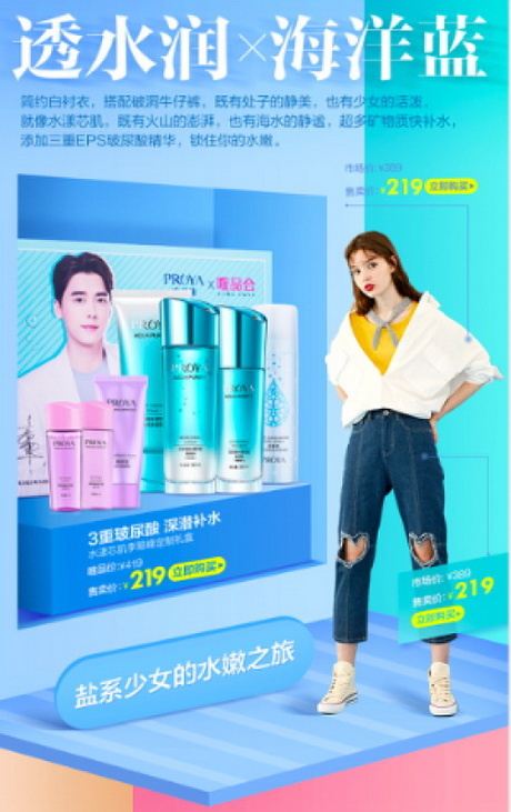 标品与非标品的结合,如何在产品上进行定制化的创新和捆绑从来是困扰着业界的难点。作为美妆和服饰业界知名的两大品牌,珀莱雅与太平鸟集团在此次联合上有着令人惊喜的表现,例如主打的“透水润×海洋蓝”组合,太平鸟的简约白衬衣搭配牛仔裤带来少女的纯洁与朝气,正与珀莱雅水漾芯肌礼盒的气质完美契合,开启盐系少女的水嫩之旅,速配同一调性的产品精准搭配推荐,不但让消费者对产品记忆更深刻,也通过组合直接带动消费者下单购买。在活动中,原价389元的太平鸟牛仔裤仅需219元,原价419元的珀莱雅礼盒更是直降200元,便利之余更有钜惠福利。除了这一组合之外,还提供了“零细纹×黑红控”,“伪素颜×纯净白“, “真闺蜜×黑白配”等多种产品搭配组合,给不同用户带去多元化的选择,致力于让年轻人“发现,新的我”。