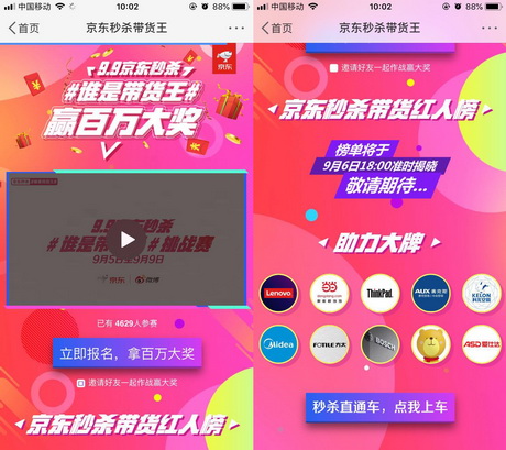 以创新的形式,全面挖掘微博红人价值,“9.9京东秒杀《谁是带货王》”挑战赛打造了一场极致的购物狂欢,发挥品牌、红人、粉丝以及消费者各方力量,共同打造社交电商行业的全新IP。9月9日,“京东秒杀带货王”即将诞生,再次迎来京东秒杀狂欢日的社交高潮,百万大奖花落谁家,让我们拭目以待!