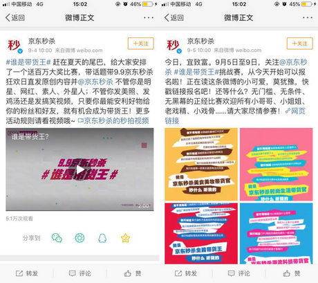集结微博红人,”9.9京东秒杀《谁是带货王》”挑战赛通过比赛的方式,首次将网红的带货能力真实地亮相于大众面前,打造了社交电商行业全新IP,为网红价值及品牌建设提供了前所未有的营销视角。