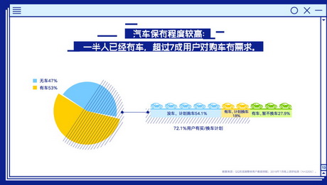 在购买汽车大件商品上,报告显示这部分人群的消费需求同样令人不可小觑。“有闲青年“中大部分都有购车能力,有车一族占到53%,没有购车占到47%,而在这部分没有买车群体中,有购车计划的占到接近超过半数54.1%,”有闲阶级“中有买或换车计划的占到72.1%之高,这对于汽车厂商在一线城市限车限号的背景下,下沉渠道走出”乡镇包围城市“的新路线有着不小的启示。同时,这部分群体对汽车的性能、安全性最为关注,并且非常善于从资讯中获取信息对比品牌,汽车保养、新能源、家用型、SUV、奔驰成了他们热搜的五大关键词。