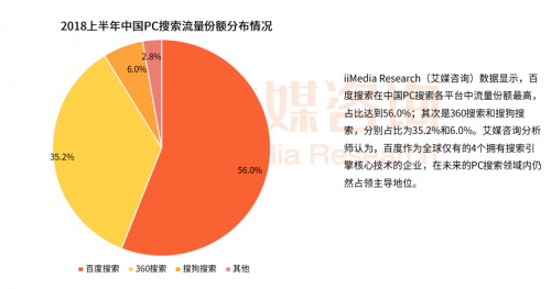 艾媒数据显示,总体看,PC搜索普及程度较高,用户市场呈现饱和状态,2018年用户规模达到6.88亿,360搜索以35.2%的流量份额把持着行业第二大搜索的位置。