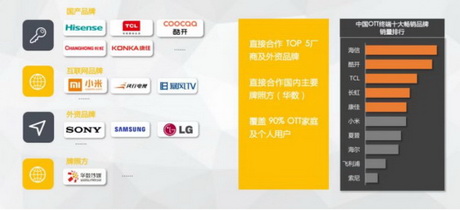 为了进一步实现产品的目标,聚壹科技显然无法独立完成这些工作,一个完整的生态和合作伙伴就是目前聚壹科技所需要考虑的显示。而在选择合作伙伴的时候,聚壹科技首先看重的是那些数据能力、技术综合能力较强的,并能提升OTT运营效率的合作伙伴。例如上图所提到的:TCL、康佳、小米以及下图中的奥维、TalkingData等企业。