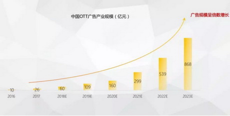 随着OTT终端规模的不断积累及产业链相关行业的积极布局,预计OTT设备激活数量将从2013年的0.5亿台增加到2023年的3.21亿台。OTT的广告规模也将成倍数增长,预计到2023年,中国OTT广告产业规模将达到868亿元,相比2018的60亿元增长了近15倍。