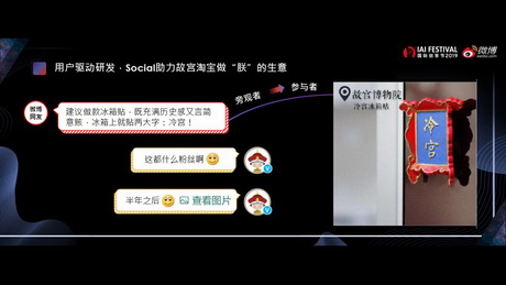 故事二:不只营销,还有研发。故宫前院长单雯翔曾在多个场合分享,2017年故宫收入就达到15亿之多。很多业内文章总结说“蛇精”的故宫小编们功不可没。不可否认,故宫淘宝的小编们很优秀,可是如果把故宫淘宝的小编挖来, 能再创造15亿的销售收入吗 ? 让我们在微博的平台上,通过描述动作,窥见他们的实践:2016年1月11日,一位网友突发奇想,建议故宫淘宝跟海尔合作,弄个冰箱贴, 叫“冷宫”,故宫淘宝的小编们调侃“这都什么粉丝啊 ”。网友们却自发地燃起来了,有的网友说,朕每天都要打开“冷宫”,这不是打脸吗?有些网友脑洞大开,喊话要 “储秀宫” 、“微服私访”公交卡套、“奉旨旅行”行李牌等等。一时间,参与互动达到五万多人次。