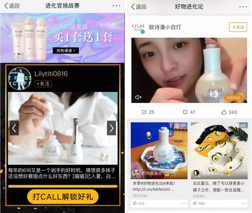 随着活动的推广,#好物进化论#邀请众多达人加盟好物进化官,发布种草内容。本次活动还打造了七大种草主题,#进化官挑战赛##倒包给你看#等短视频活动在此期间纷纷上线,数百位达人发布视频为品牌站台,邀约网友为其打call互动,欧诗漫小白灯被一路种草,获得用户疯狂点赞。