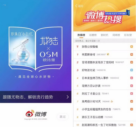 品牌广泛传播更有微博黄金资源助阵,活动期间,微博开机报头、热搜榜等重磅资源前来助力,欧诗漫小白灯全方位展现在用户浏览路径,获得海量关注。