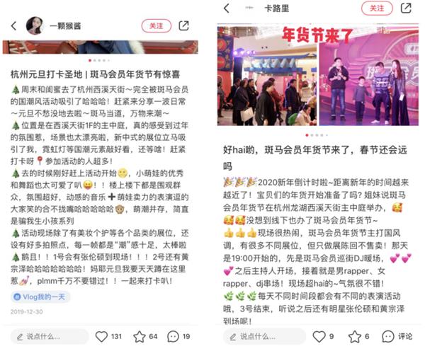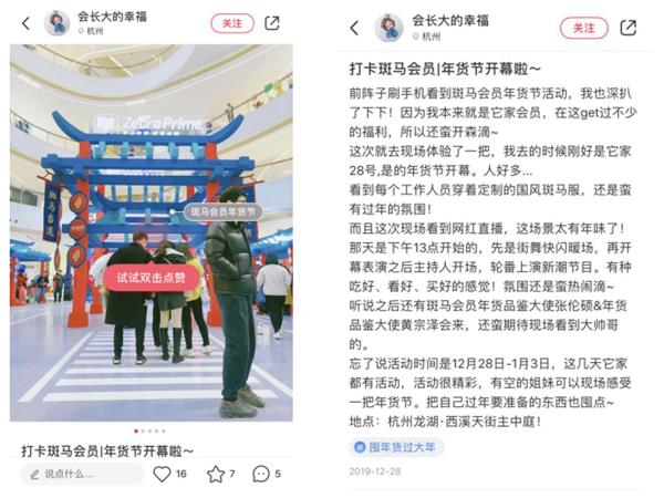 当“私域流量”成为一众电商营销玩法中的新趋势,除了有微博相关KOL带上话题签,为斑马会员年货节宣传活动,更有小红书达人真人打卡斑马年货节+批量素人分享笔记,展示年货节实地真实情况,宣传活动,提升斑马会员品牌知名度。