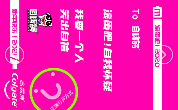 在职场PUA下,我们常常会感到迷茫,开始怀疑自己的判断力与工作能力,高露洁回复自嗨锅的海报以一处非常有创意的设计给职场人带来自信:当沿着“正确打开方式”的角度看,原本的“?”变成了笑脸——不必怀疑自我,我要笑出强大。