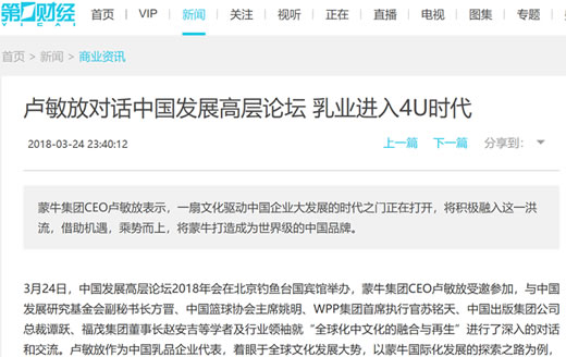 蒙牛曾是联华盛世重点服务的企业之一。中国乳业已进入第二个黄金十年,蒙牛以怎样的姿态和行动面对“新时代”,影响着企业的市值和未来发展。在企业年报发布前夕,联华盛世帮助蒙牛超前布局,提前“埋线”,进行重要议题构建,输出核心价值,营造舆论环境。联华盛世基于“用户力”时代,为蒙牛提炼出中国乳业“4U时代”的概念,通过高端论坛及企业领袖发声的形式向外界传播。利用这一吸引眼球的行业议题与竞争对手拉开差距,凸显蒙牛的前瞻性与领导力,成功助力蒙牛抢占乳品行业价值制高点。在年报发布时,结合“用户力”和“4U时代”对企业业绩进行全维度解读,占领舆论高地,提升投资者信心与信任。