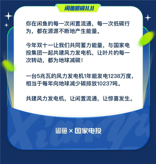 所有用户共同参与闲鱼低碳11.11所产生并累计的能量,会解锁一个具有终极荣誉感的环保举措与成就——与国家电投集团共建风力发电机。也就是说,每个产生低碳行为的用户,都有机会成为“低碳合伙人”,获得建设证书及限定勋章。