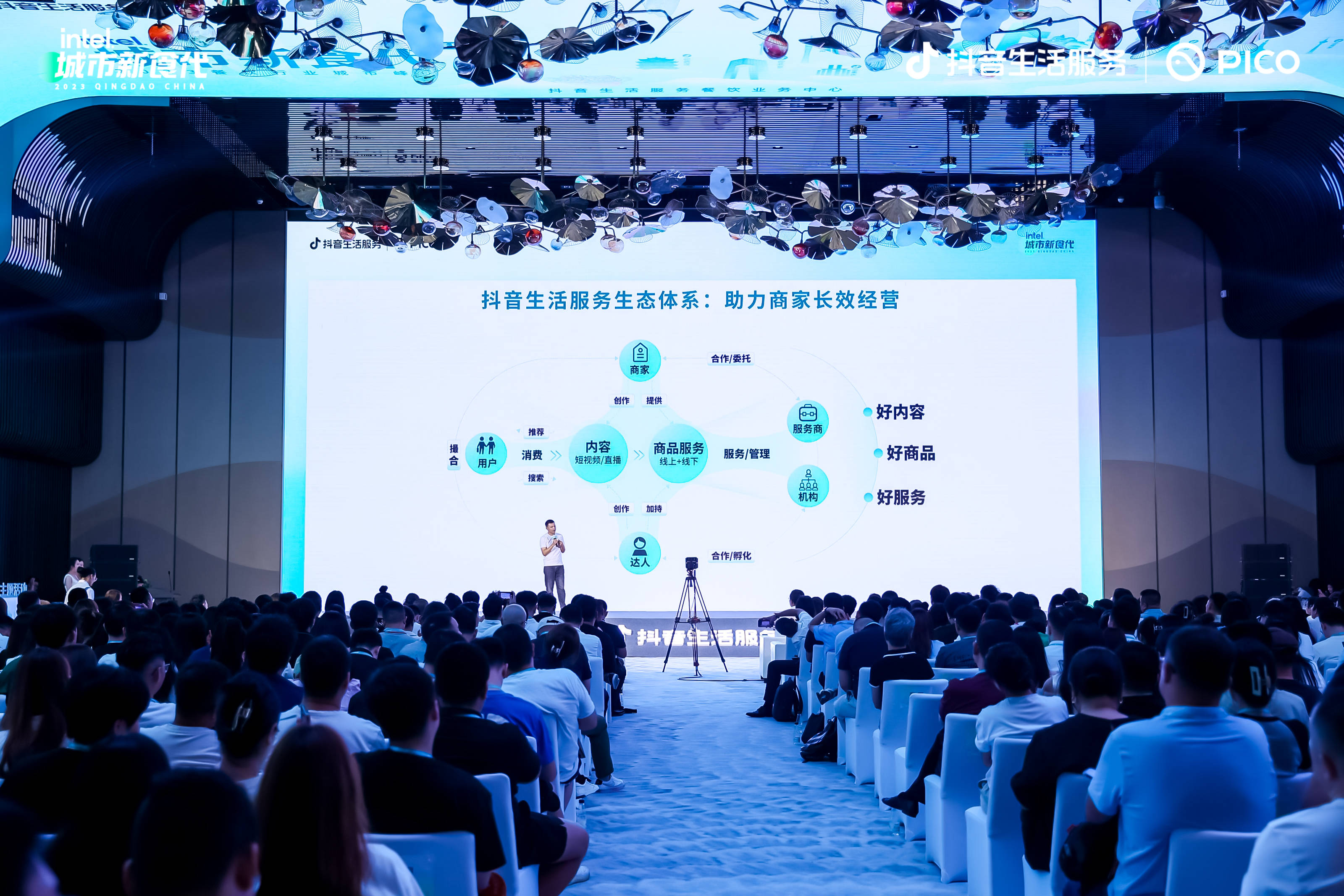 峰会上,抖音生活服务餐饮行业商圈华北业务总监王军炜以“遇见青岛·点亮城市新生活”为主题,从分析青岛餐饮市场现状入手,剖析用户消费需求、解读销量增长新路径。在数字化视角下,抖音生活服务为了让更多的餐饮商家经营有方法, 借助LIFE 经营矩阵提供了系统化解决方案,商家可根据自身的经营规模、经营阶段、经营目标和经营诉求,形成多样的经营方法,最终实现促交易和打品牌的经营价值。
